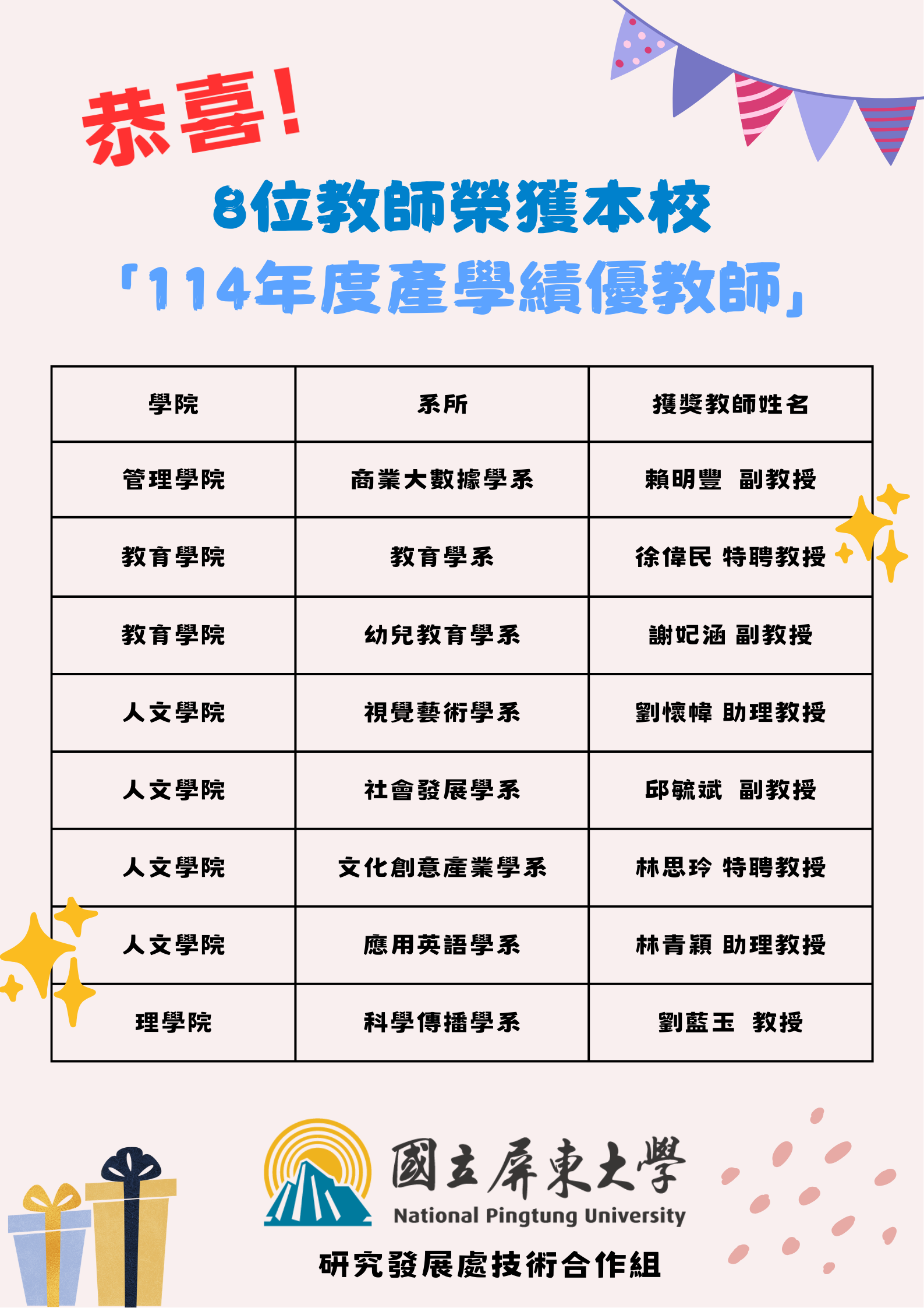 恭賀!8位教師榮獲本校「114年度產學合作績優教師」