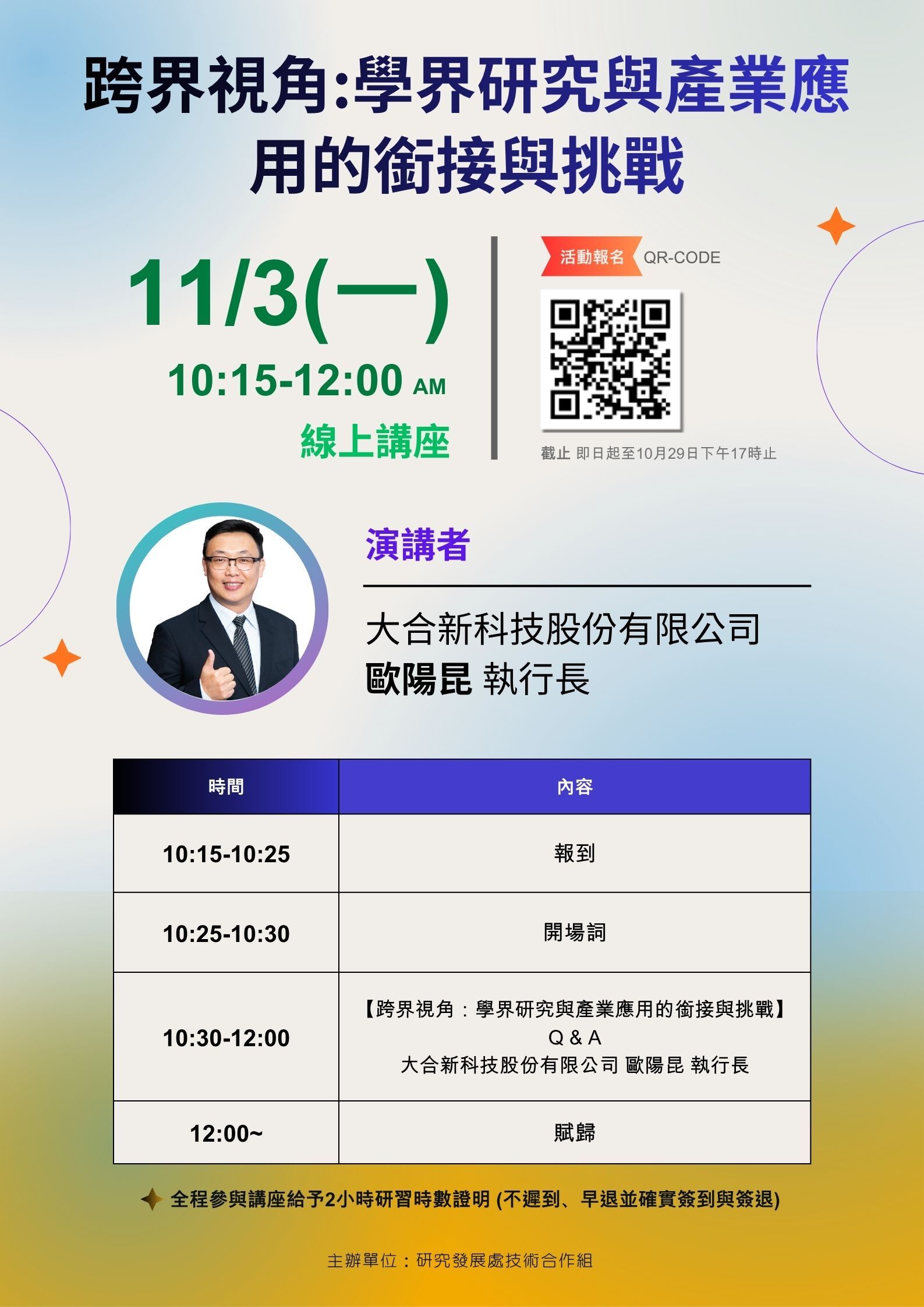 研發處於114年11月3日辦理「跨界視角:學界研究與產業應用的銜接與挑戰」講座,請有興趣之師長/同仁踴躍報名參加,謝謝。
